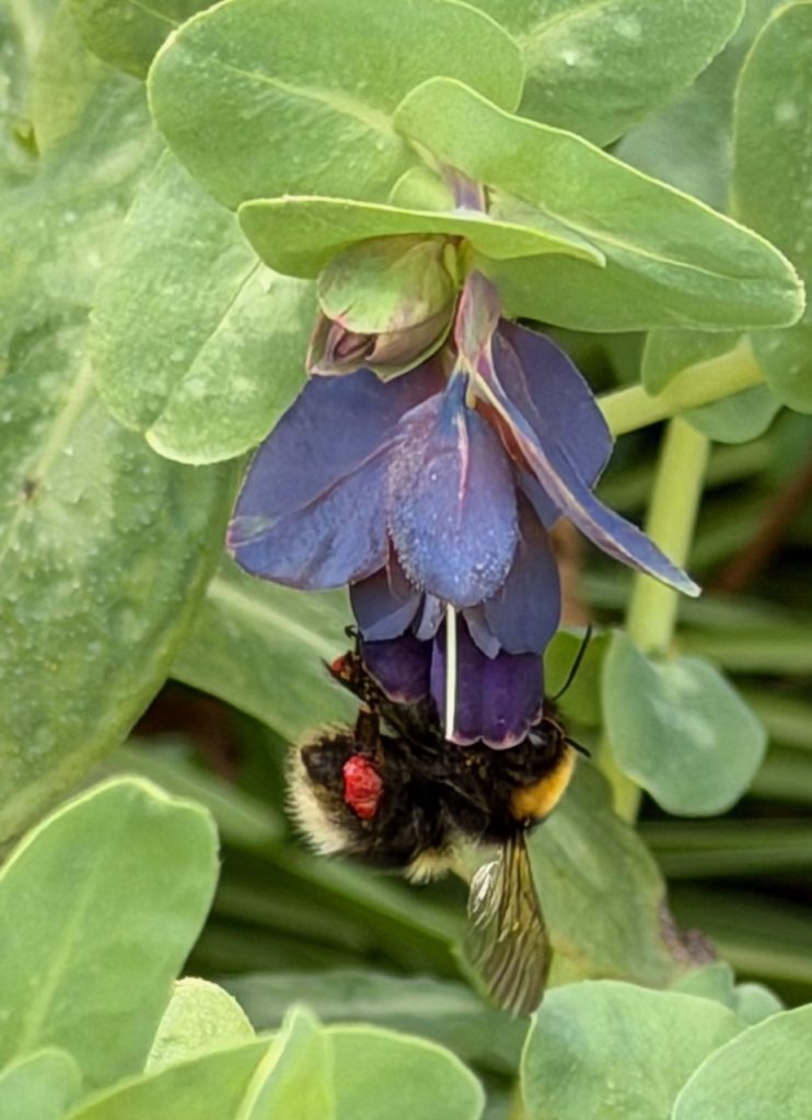 If you’ve got this plant growing in your garden, you may have noticed it comes with sound-effects, especially in spring. Otherwise known as honeywort, the flowers of this plant are rich in nectar and a magnet for longer tongued pollinators like the hairy footed flower bee (Anthophora plumipes) and our carder bumblebee (Bombus pascourum) as well as the garden bumblebee (Bombus hortorum) and our red tailed bumblebee (Bombus lapidarius). These bees can reach inside the longer, tubular flowers for the nectar.